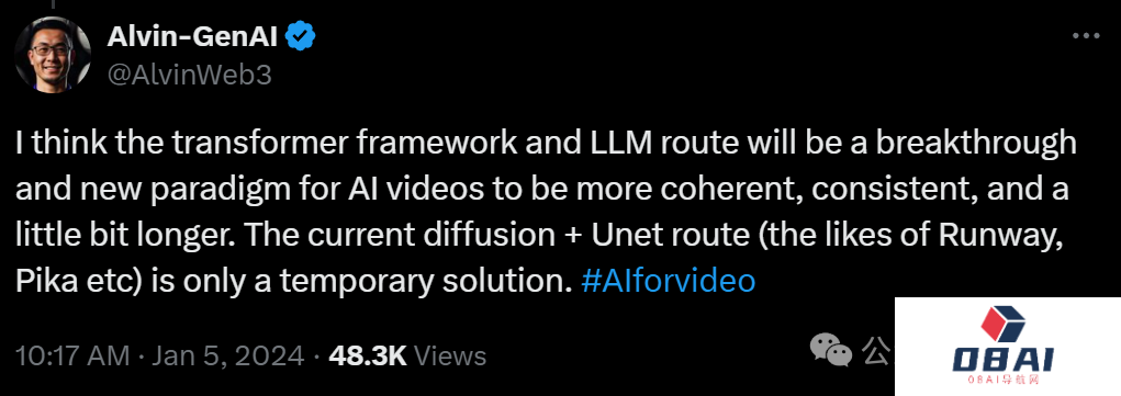 我认为,Transformer框架和LLM路线,将是AI视频的一个突破口和新范式,它将使AI视频更加连贯、一致,并且时长更长。目前的Diffusion+Unet路线(如Runway、Pika等),只是暂时的解决方案。