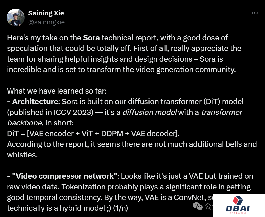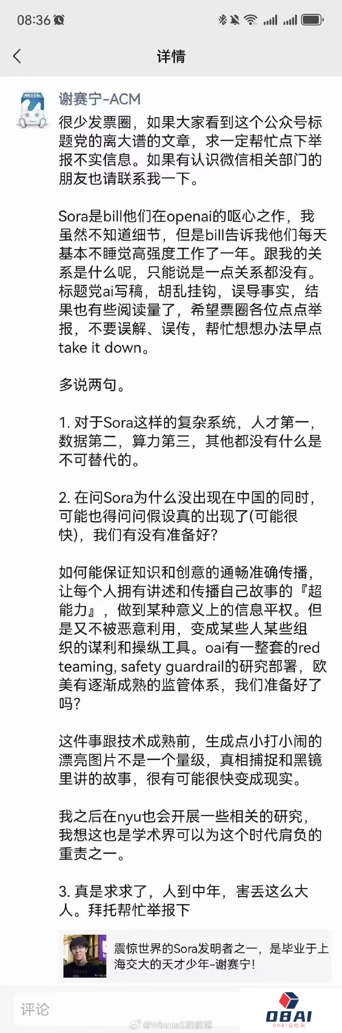 最近,谢赛宁对说自己是Sora作者的说法进行了辟谣