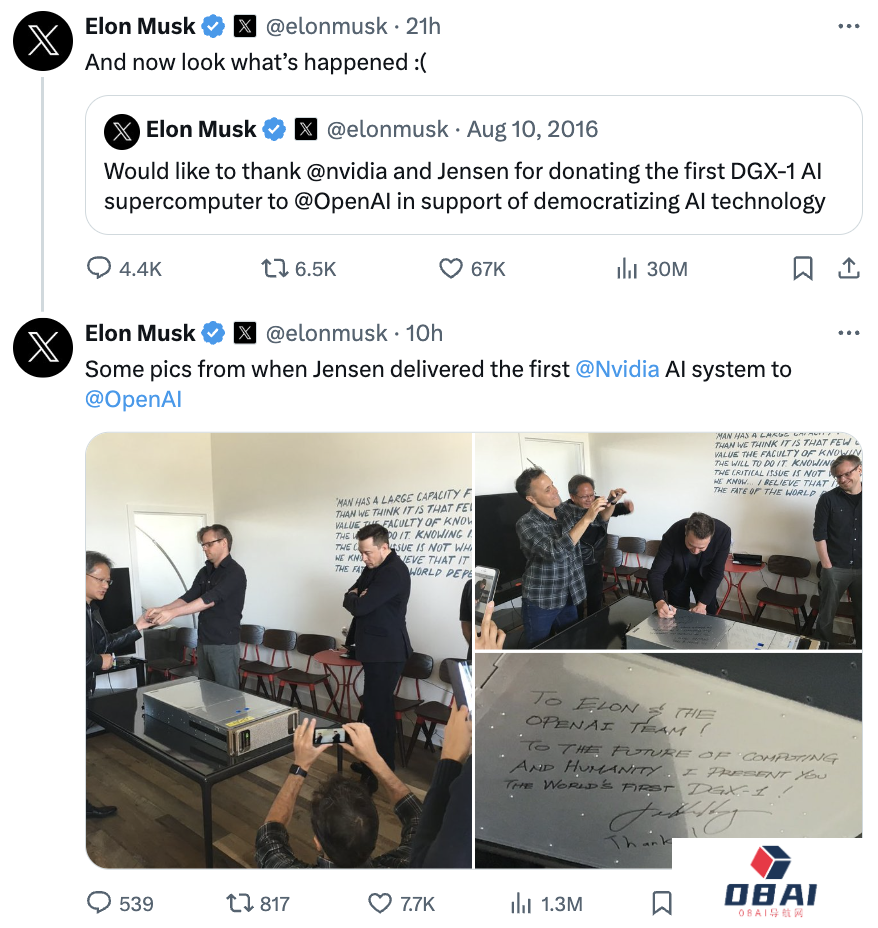 他转发了2016年8月OpenAI第一次收到英伟达捐赠DGX-1 AI超级计算机的推文,并说“现在看看发生了什么”。同时他还转发了同天发布的OpenAI公司入口处照片,并@艾特OpenAI官号表示,这才是他与其他OpenAI的创始人“最初创建的原因”。