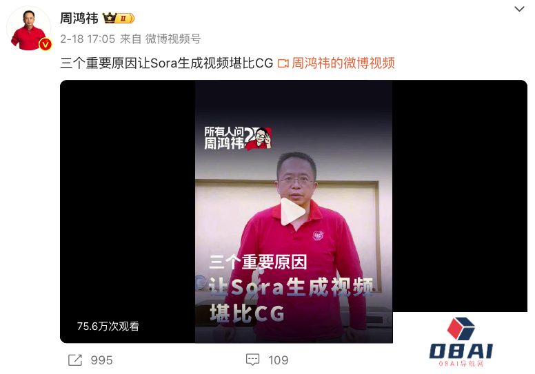 针对近日大火的Sora视频生成模型不断冲击着科技圈,360集团创始人、董事长兼CEO周鸿祎分享一些自己的观点。