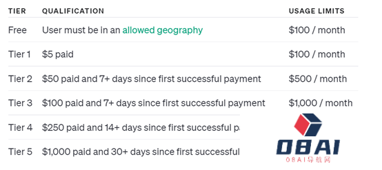 随着你对 OpenAI 的API 的使用以及组织在AP上的费用支出的增加,会自动升级你的使用级别。目前,一共有5个等级。