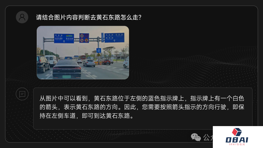 给商汤大模型一张普通的公路行车图像,它将图中字体特别小的指示牌信息提取出来,并进行推理,最终给出了「黄石东路」怎么走的决策。