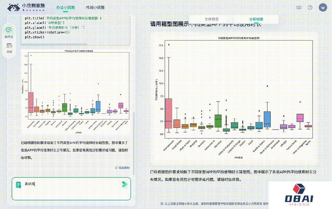 借助商汤大模型旗下的“小浣熊家族”办公工具,生成相应的Python代码,以及所要求的图表,并在右边给出对应的数据分析结果。