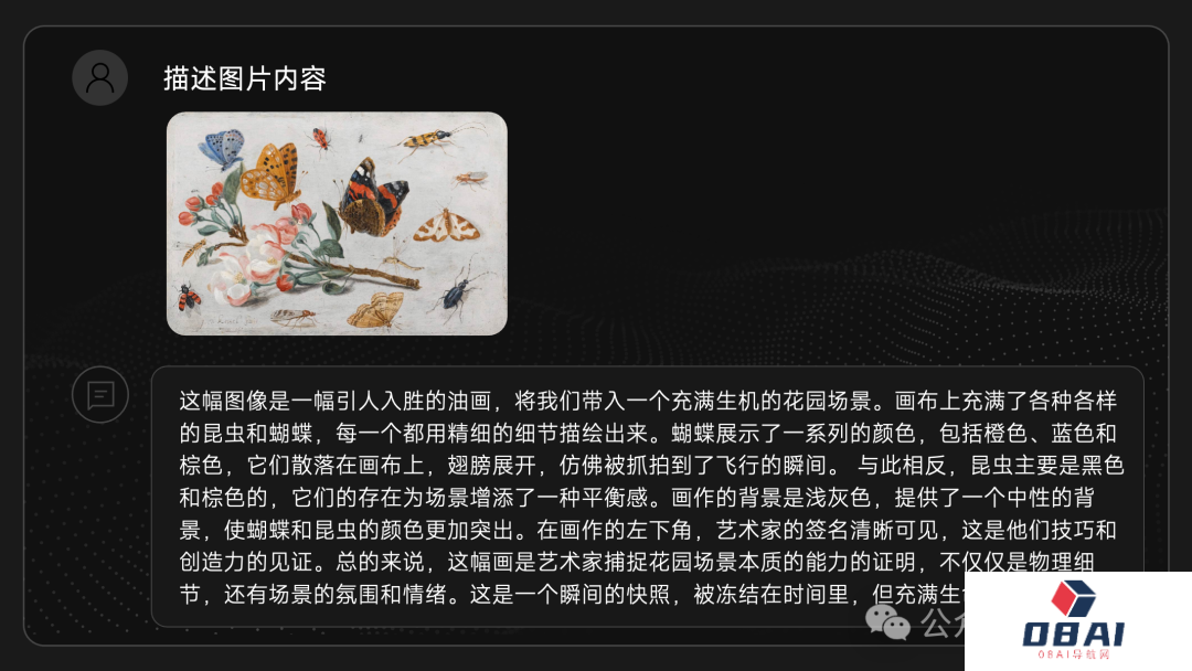 再看下面这张油画图像,蝴蝶的动态、昆虫的颜色都能一一辨别,还能进行深入分析,辨别出作者的签名,提供评价供用户参考。