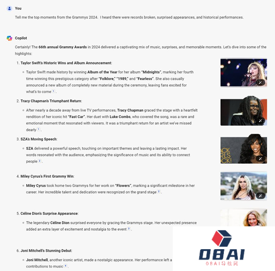 例如,向Copilot提问,告诉我 2024 年格莱美奖有哪些精彩瞬间?我听说有打破纪录的,有惊喜亮相的,还有历史性的表演。