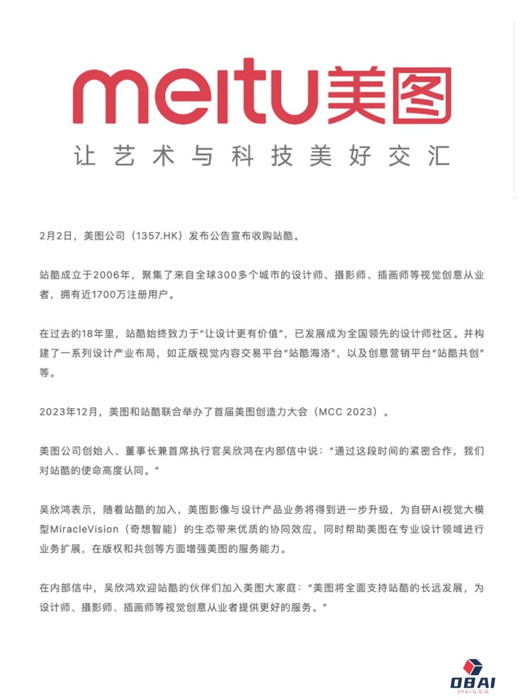 美图官方表示,通过本次针对「站酷网」的收购计划,可以加速旗下的自研视觉大模型MiracleVision(奇想智能)的应用商店生态,以及大模型训练素材版权、与内容创作者的共创能力。