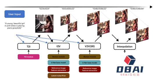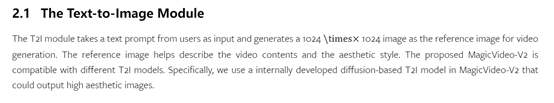 文生图像模块(Text-to-Image, T2I)主要用于接收用户提供的文本描述作为输入,并生成一个1024×1024像素的图像作为视频生成的参考图像。这有助于增强视频的内容和美学风格。