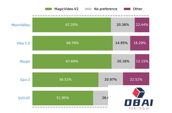 MagicVideo-V2公布的实验评测数据显示,视频的高清度、润滑度、连贯性、文本语义还原等方面,比目前主流的文生视频模型Gen-2、Stable Video Diffusion、Pika 1.0等更出色。