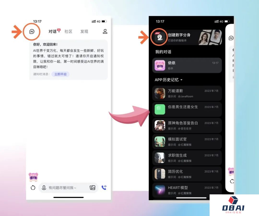 「数字分身」功能需要将手机的“文心一言”客户端更新到最新版本的APP之后,点击界面左上角「AI」侧边栏,在“创建数字分身”入口进入使用。