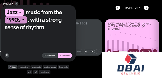 例如,生成一首90年代的爵士音乐,节奏感非常强。MusicFX可以一次生成4个同类音乐,用户选择最佳那款即可。