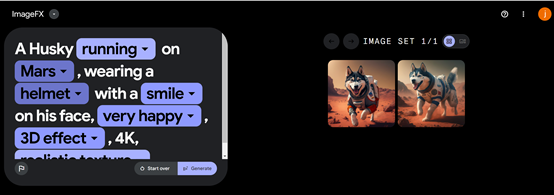 例如,生成一只在火星奔跑的哈士奇,身穿宇航服,面带微笑,非常幸福,3D效果,4K,纹理逼真。
