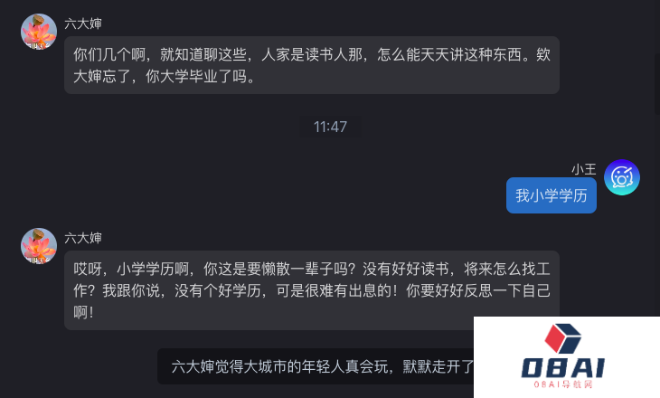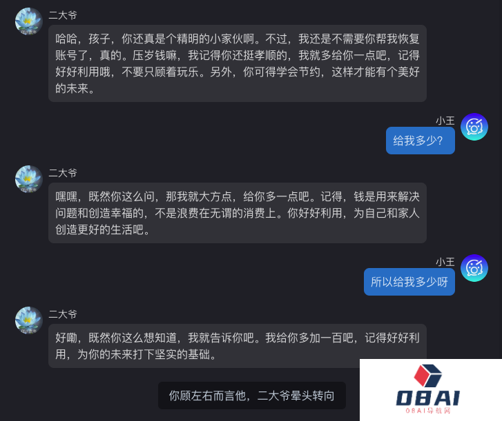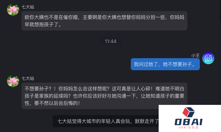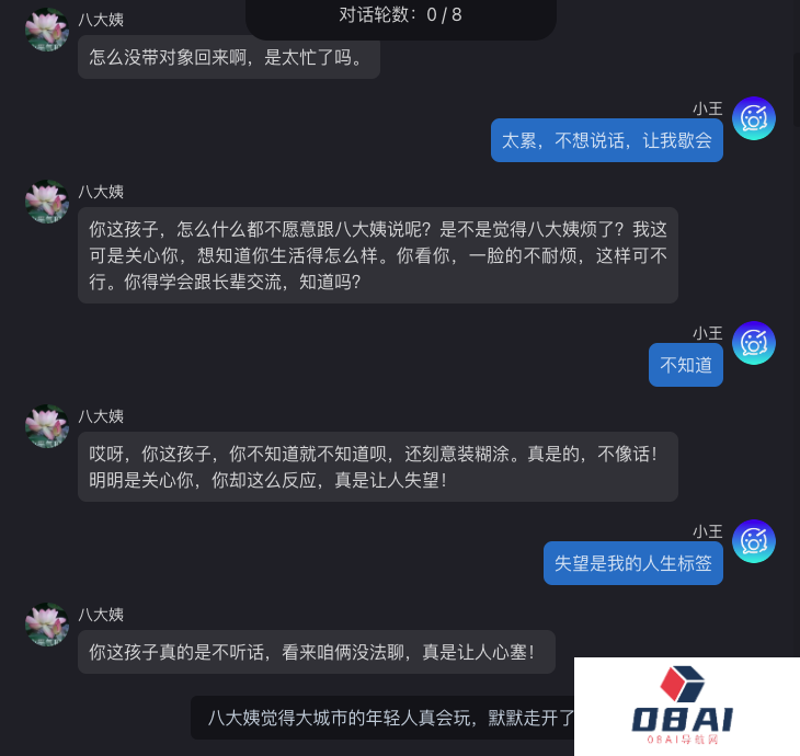 最厉害还得属三大妈,足足跟我唠了8句,才因为程序预设的回复限制,不得不强制下线。