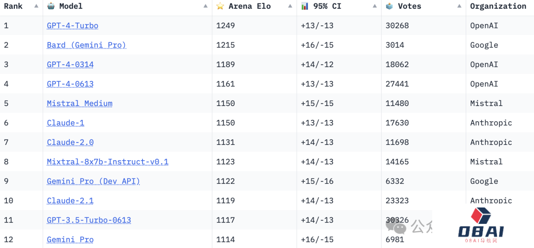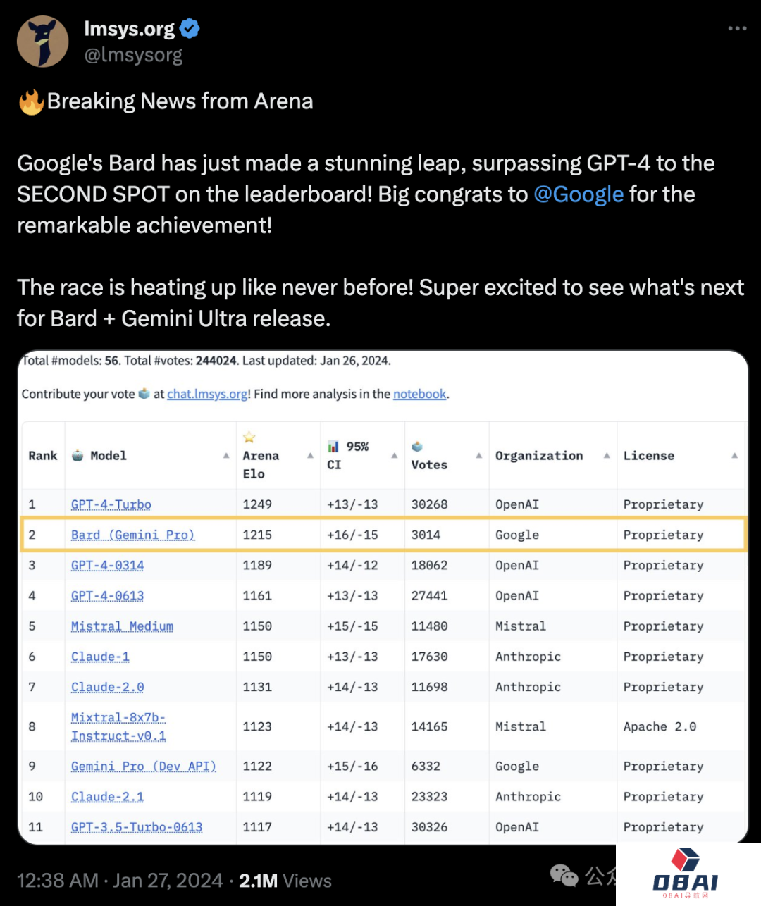 可以看到,在最新的Gemini Pro-scale加持下,Bard直接蹿升到了排行榜第二名的位置。