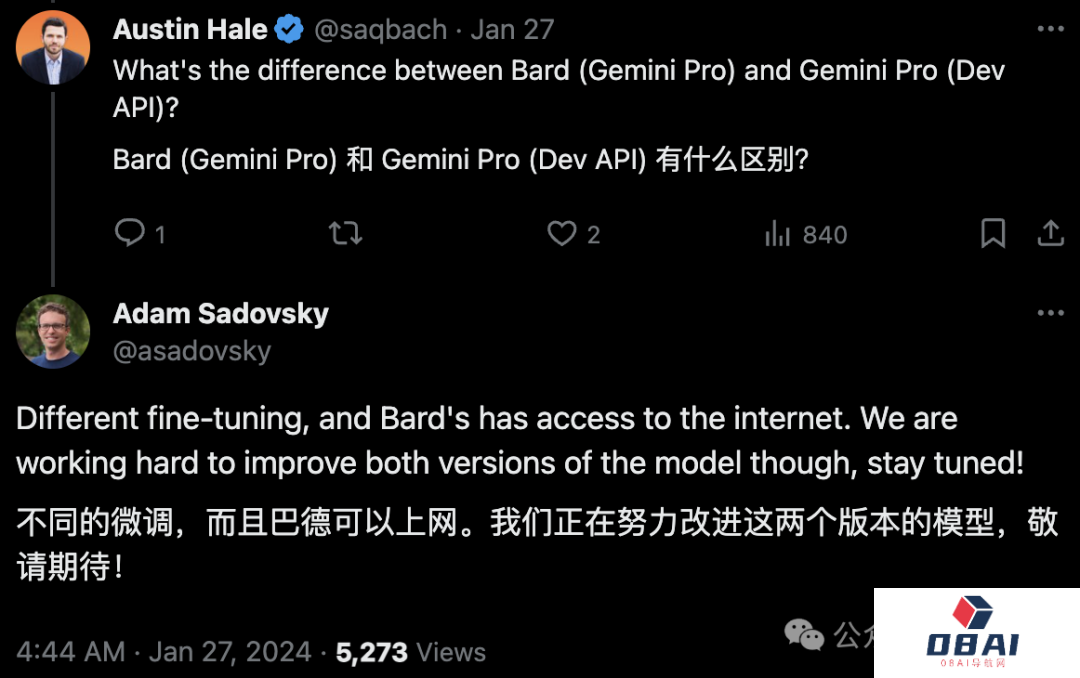 同时,谷歌Bard项目的高级总监Sadovsky也透露,排行榜上的Bard和Gemini Pro(API)是两个在微调层面不同的模型,而且Bard可以检索互联网上的信息。