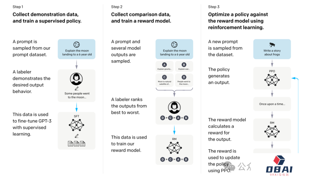 在这里,OpenAI定义了一套标准流程:预训练 -> 监督式微调 ->RLHF。直到今天,这依然是大家遵循的基本策略(尽管有些许变化,比如DPO)。