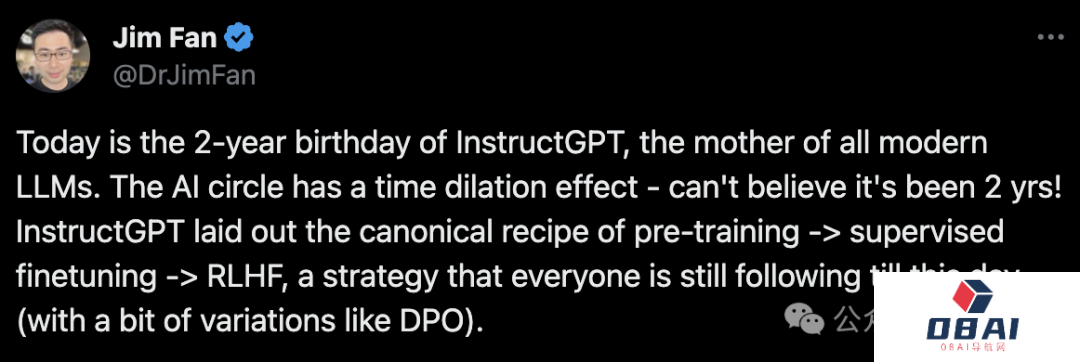 今天,英伟达高级科学家Jim Fan发推纪念了InstructGPT发布二周年。