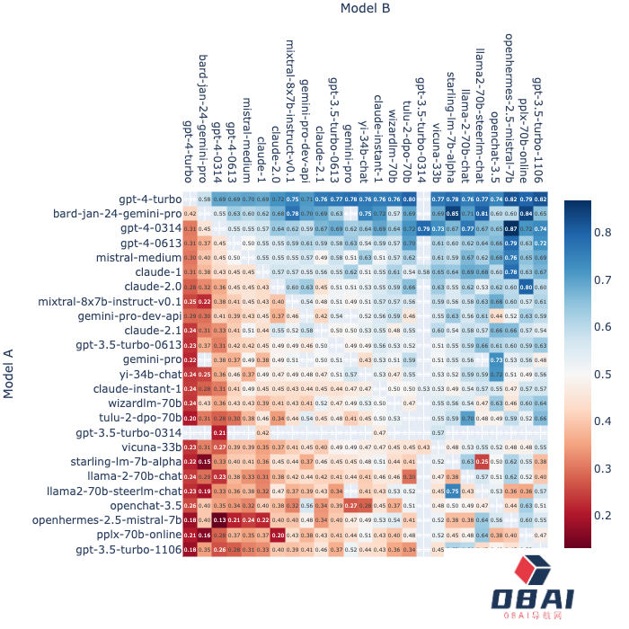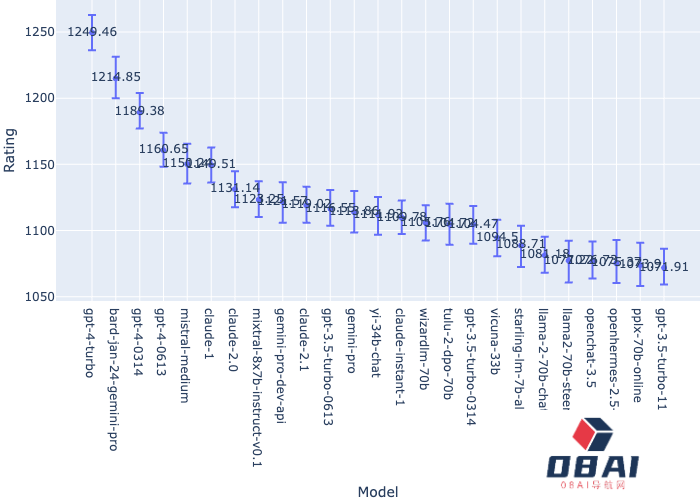 而且,这个Elo评分的数值是绝对的。也就是说,当未来加入新的聊天机器人时,我们依然可以直接通过Elo的评分来判断哪个聊天机器人更厉害。