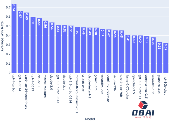 在假设等概率抽样和不存在平局的情况下,相对于所有其他模型的平均胜率