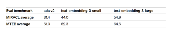 1)性能更强:根据OpenAI公布的性能测试,小文本嵌入模型的多语言检索(MIRACL)常用基准的平均得分从 31.4% 增加至 44.0%;英语任务(MTEB)常用基准的平均得分从 61.0% 增加到 62.3 %。