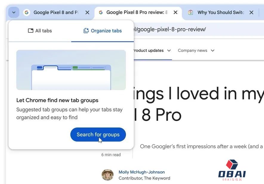 在浏览器的左上角,选择“组织标签卡”,再点击“搜索管理组”,让AI帮你发现可以合并的选项卡。