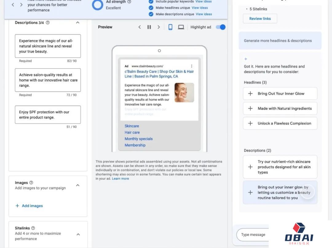 此外,Google Ads还提供了“文生图”功能。例如,借助Google AI快速创建一张美妆商品的海报,帮助电商运营用户快速生成吸引消费者点击的产品图像。