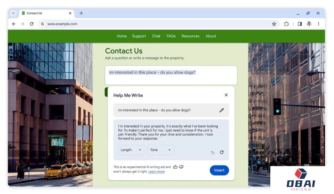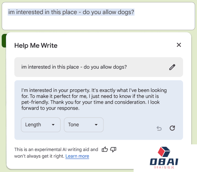 然后输入一段简短文本提示。例如,写一封邮件——“我可以在这里养狗吗?”