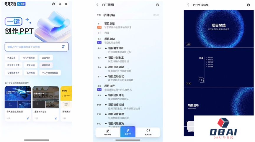 用户在进入“夸克文档”频道后,点击“AI PPT”入口,就能通过输入 PPT 主题或选择 AI 模板自动生成一份平均 25 页的提纲。随后,用户可根据自己需求进行文字、图片及版式的个性化修改,生成 PPT 成品。