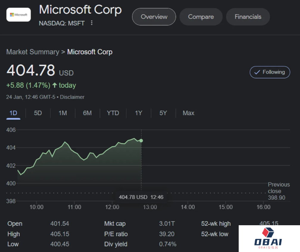 当地时间1月24日本周三,微软美股股价在纳斯达克交易所上涨多达1.5%,股价市值来到了3万亿美元,成为继苹果之后第二家估值达到这一里程碑的公司。
