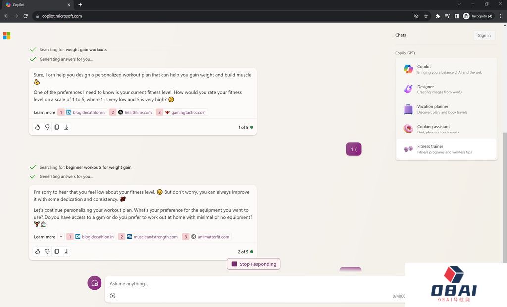 Copilot GPTs服务将面向所有普通用户开放,目前仅提供了几款只健身、设计或烹饪等官方开发的GPTs应用。