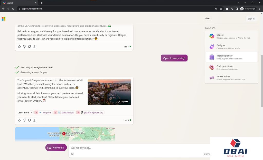 Copilot GPT 不需要微软账户或 Edge 浏览器。可以在 Chrome 内核的浏览器上运行,无需登录微软账号的情况下访问 GPTs 功能。