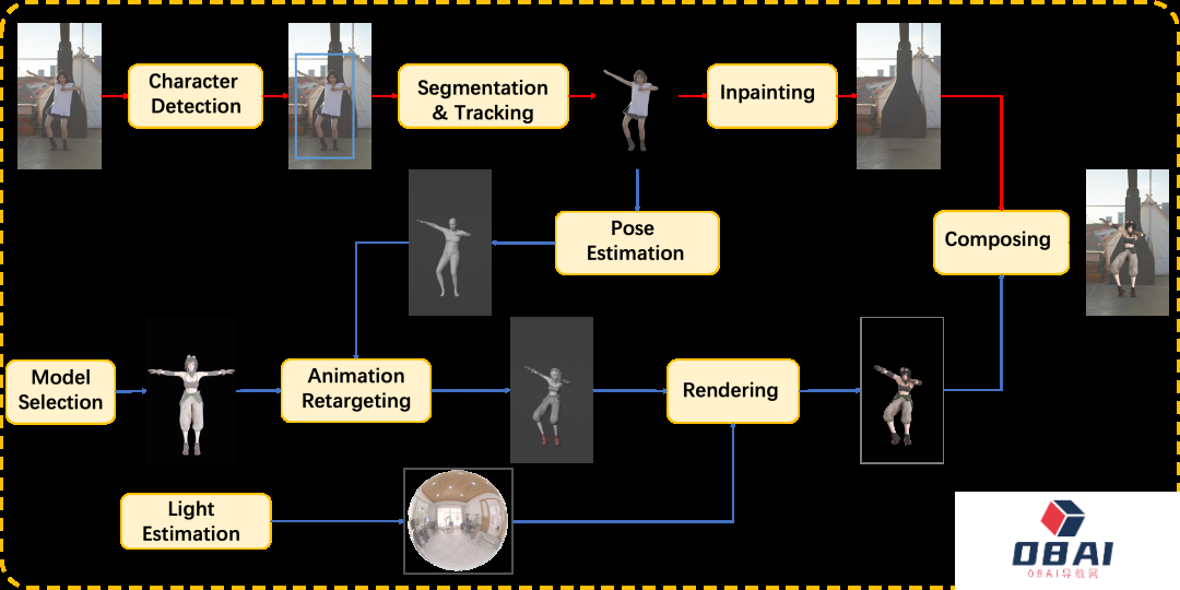 我们可以通过上边这个技术原理分解图,大致了解到,如何使得二次元人物临摹「科目三」舞蹈片,从而得到一段替换人物的跳舞视频。
