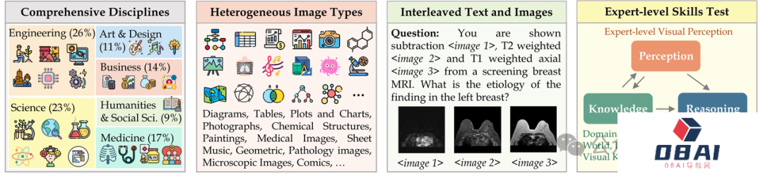MMMU(大规模多学科多模态理解和推理)数据集包含了11500个来自六大核心学科,涵盖艺术与设计、商业、科学、健康与医学、人文与社会科学以及技术与工程的问题,涉及高度异构图像类型和交织文本图像信息,对模型的高级知觉和推理能力提出了极高要求。