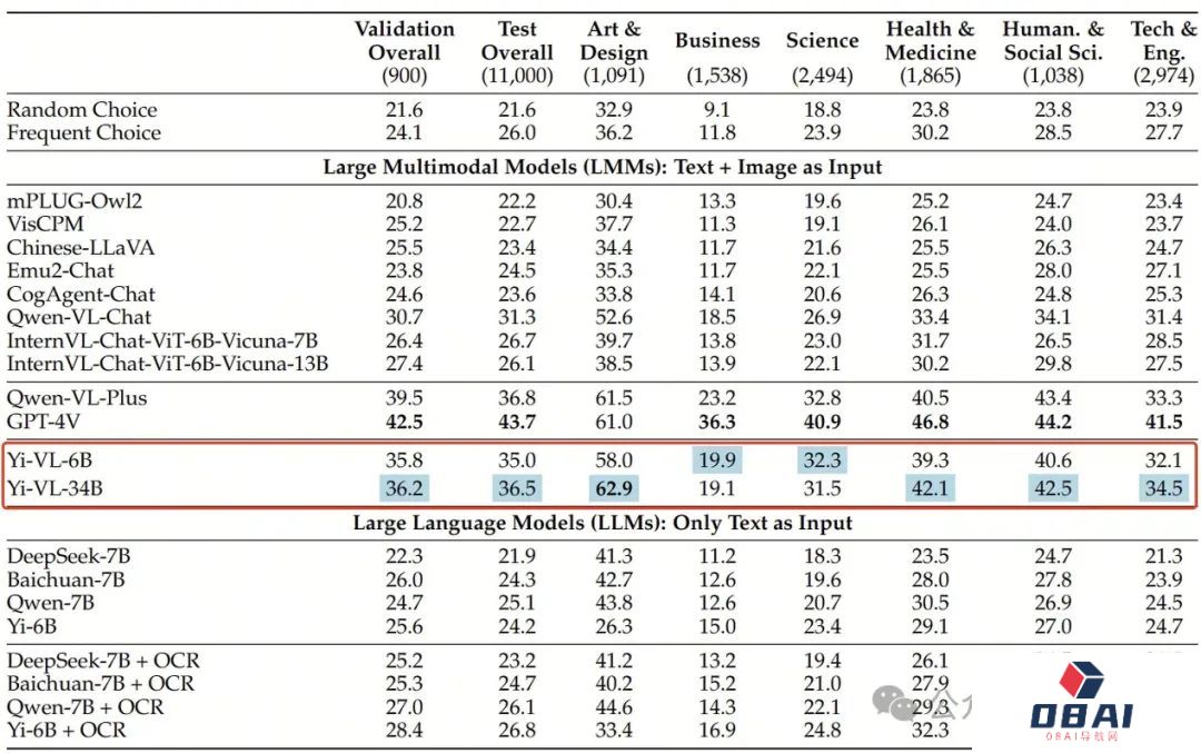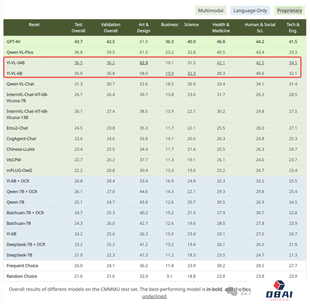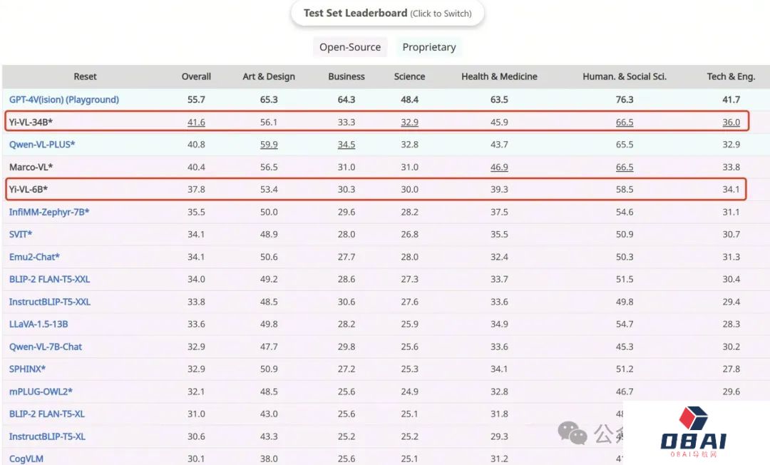 在全新多模态基准测试MMMU中,Yi-VL-34B、Yi-VL-6B两个版本均有不俗表现。
