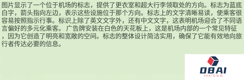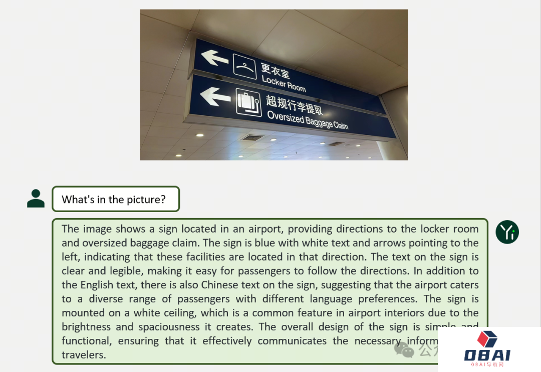 Yi-VL对整幅图做了详细分析,不仅说明了指示牌上的内容,甚至连“天花板”都有照顾到。
