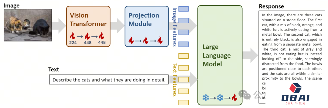 第二阶段,将ViT的图像分辨率提升至448x448,让模型更加擅长识别复杂的视觉细节。此阶段使用了约2500万“图像-文本”对。