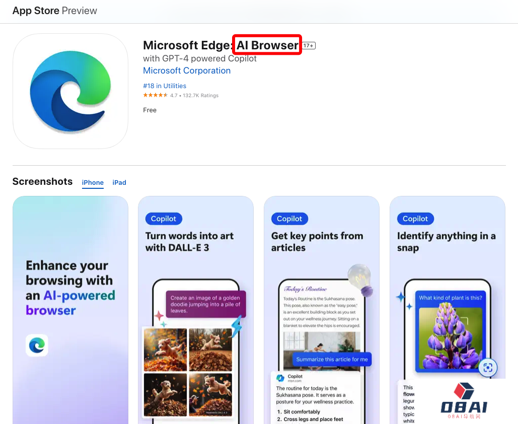 除了冠以新的名字,在这款浏览器软件的功能介绍里边的也大篇幅地宣传了新的生成式人工智能功能,如 DALL-E 3 图像生成器、Copilot 文章摘要、图像识别等。此外,该介绍还强调了对 GPT-4 的支持,称微软 Edge 是“你的人工智能浏览器”。