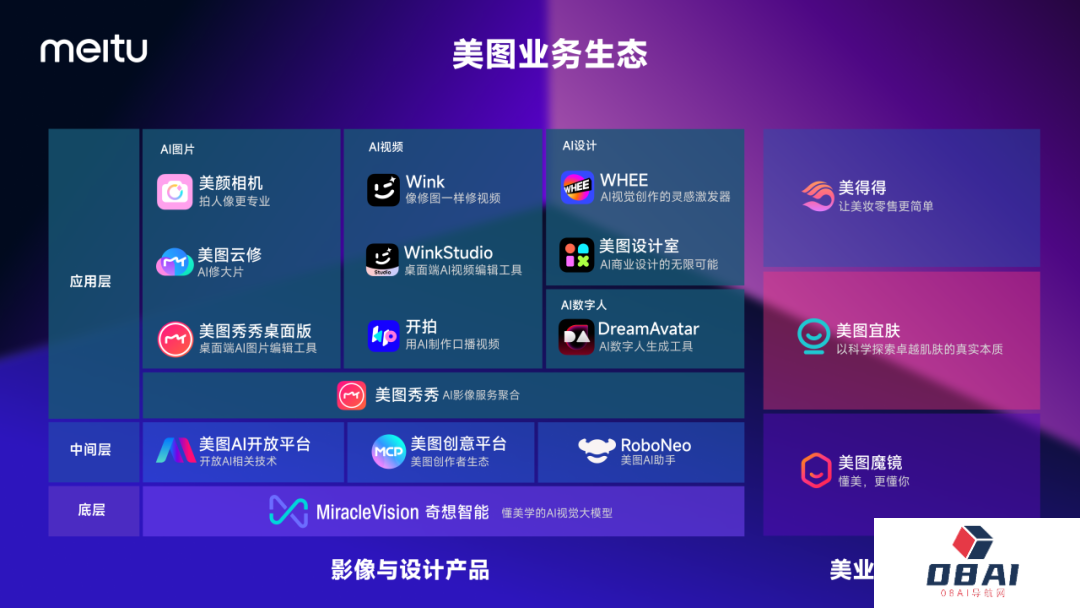 美图 AI 视觉大模型 MiracleVision(奇想智能)首个版本发布于2023年的6月份,截至目前已经迭代了4个版本。为美图秀秀、美颜相机、Wink、美图设计室、WHEE、美图云修等知名影像与设计产品提供 AI 模型能力的同时,也帮助美图公司搭建起由底层、中间层和应用层构建的人工智能产品生态。