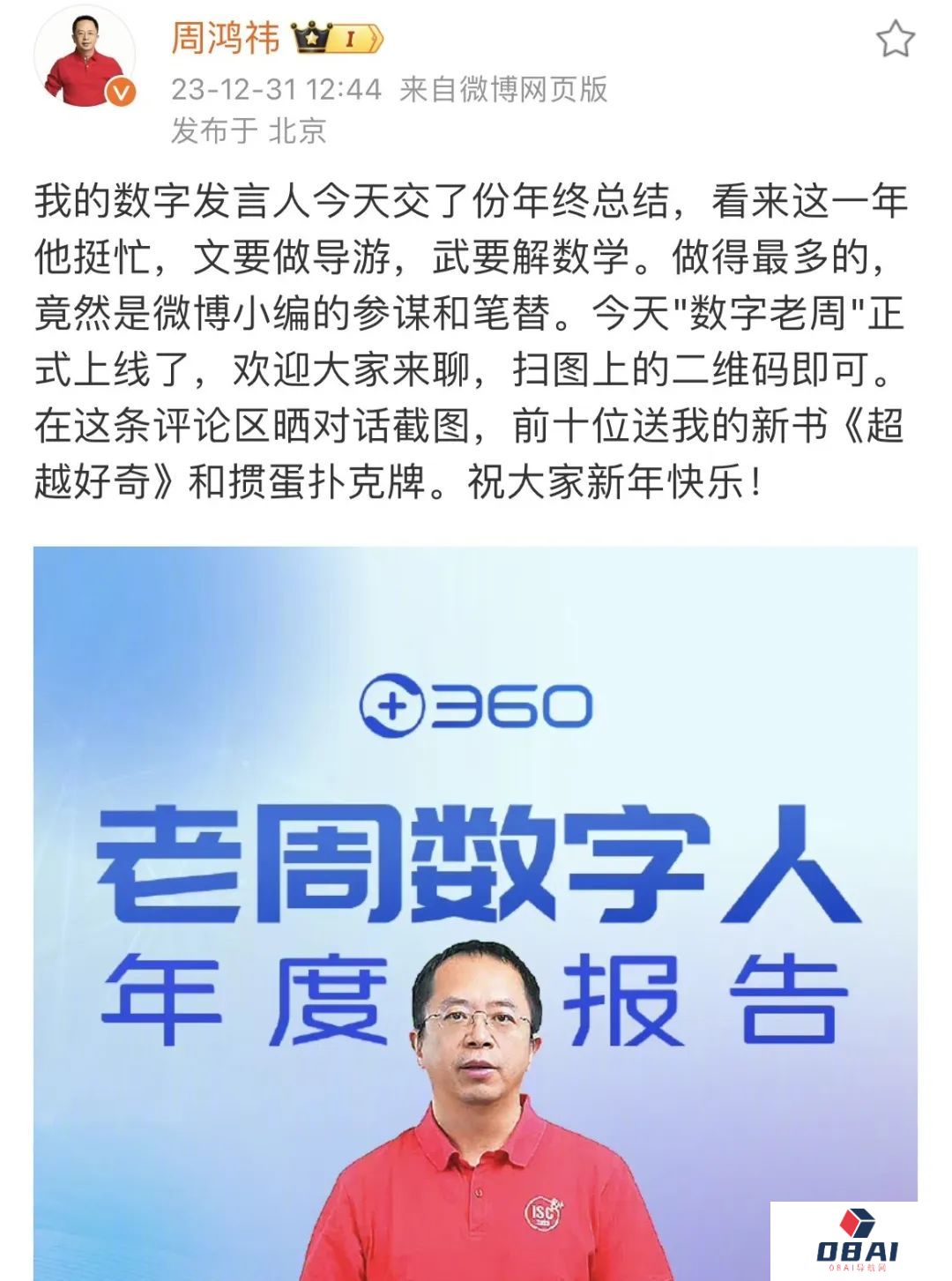 12月31日,360集团创始人、董事长周鸿祎通过微博宣布,旗下的个人数字形象代言人、数字发言人“数字老周”正式上线,并通过AI数字人周鸿祎公布一份集团的年度报告。