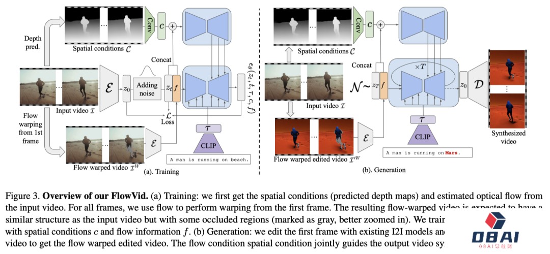(b)生成:用现有的I2I模型编辑第一帧,并利用输入视频中的光流得到光流扭曲编辑后的视频。这里,光流条件和空间条件共同指导输出视频的合成。