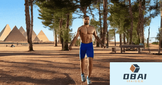 提示:一位光着上身的男士在公园锻炼,背景是遥远的埃及金字塔