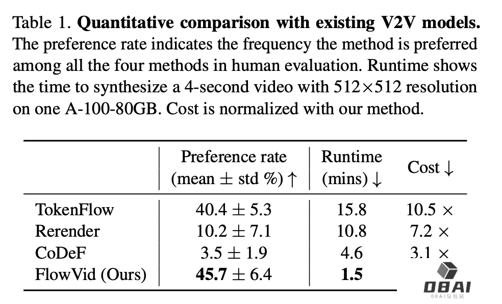 其中,偏好率是在人类评估中该方法被选择的频次。运行时间是指在一台配备了A100 80GB显卡的计算机上,合成一个分辨率为512x512、时长为4秒的视频所需的时间。而成本则是以FlowVid为基准进行归一化处理之后得到的。