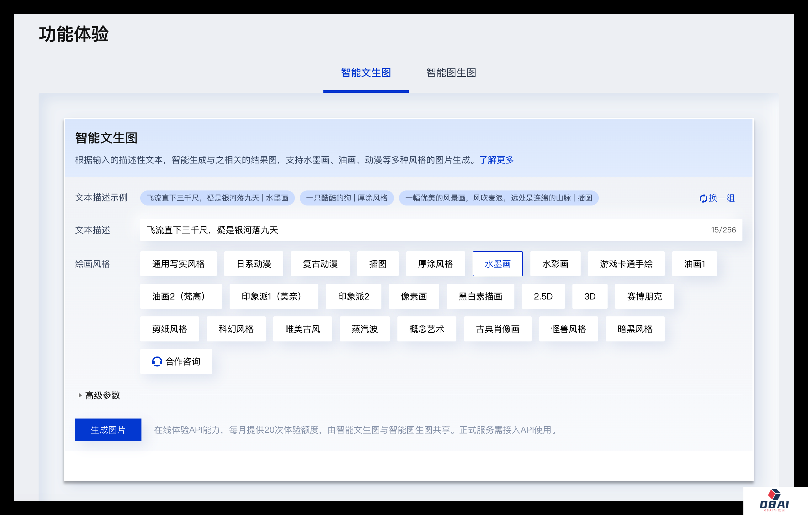 通过本次评估的API服务封装了标准化接口,可快速集成到各种云环境中,支持智能文生图、智能图生图、AI**、视频动漫化、图生动漫特效、风格定制等能力。同时,智能图生图上线全新版本,支持3D、动漫、卡通插画、水彩画等不同生成风格。