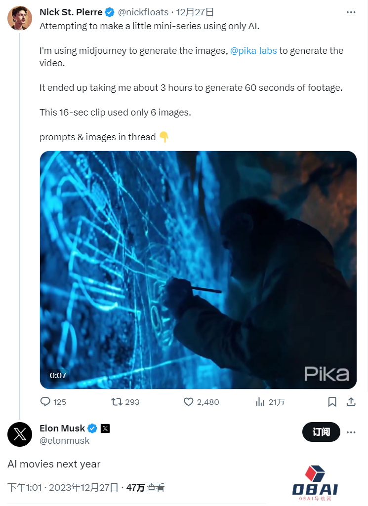 当地时间12月27日,推特(X)博主Nick St.Pierre上传了一则他通过AI视频生成工具制作的AI视频短片,称自己先用Midjourney生成图像,再用AI视频生成器Pika 1.0来引导生成AI动态视频。