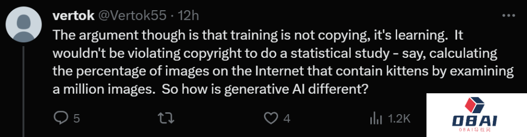有人说,分歧的矛盾点就在于,训练并不是复制,而是学习。进行统计研究,并不会侵犯版权,比如通过检查一百万张图像,来计算互联网上包含小猫图像的百分比。