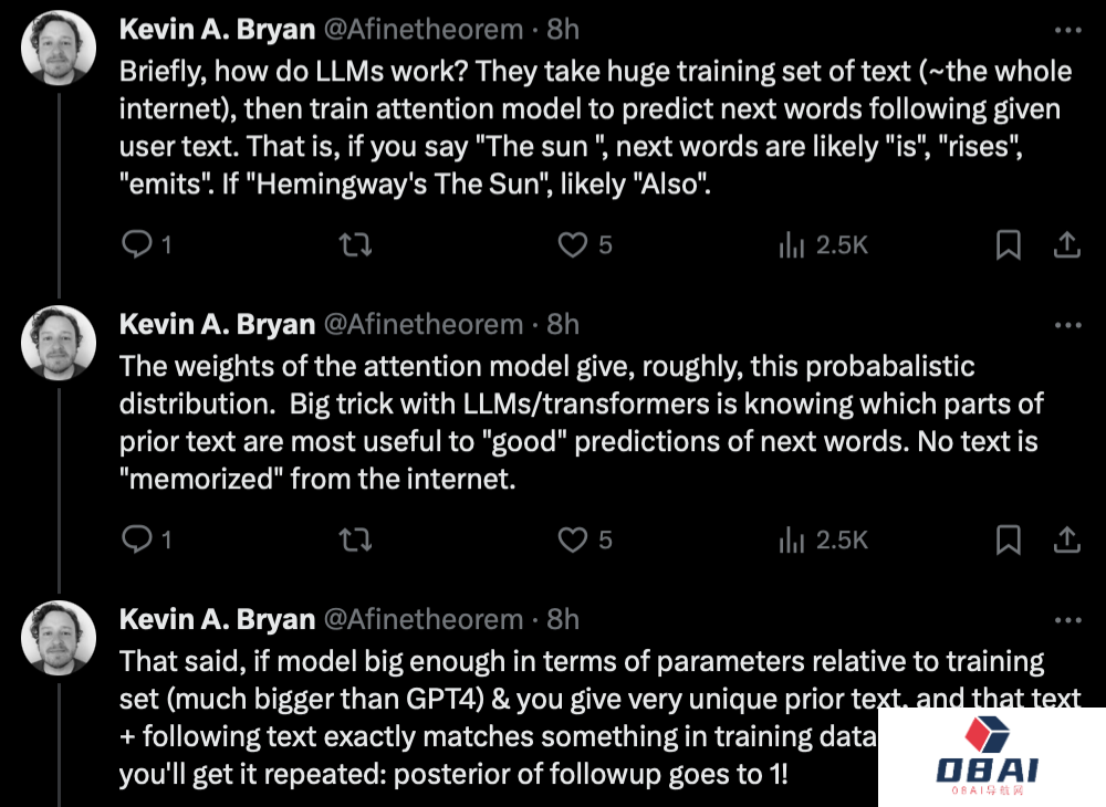 基本要点:大模型不会「存储」基础训练文本。这在技术上是不可能的,因为GPT-3.5或GPT-4的参数大小不足以对训练集进行无损编码。
