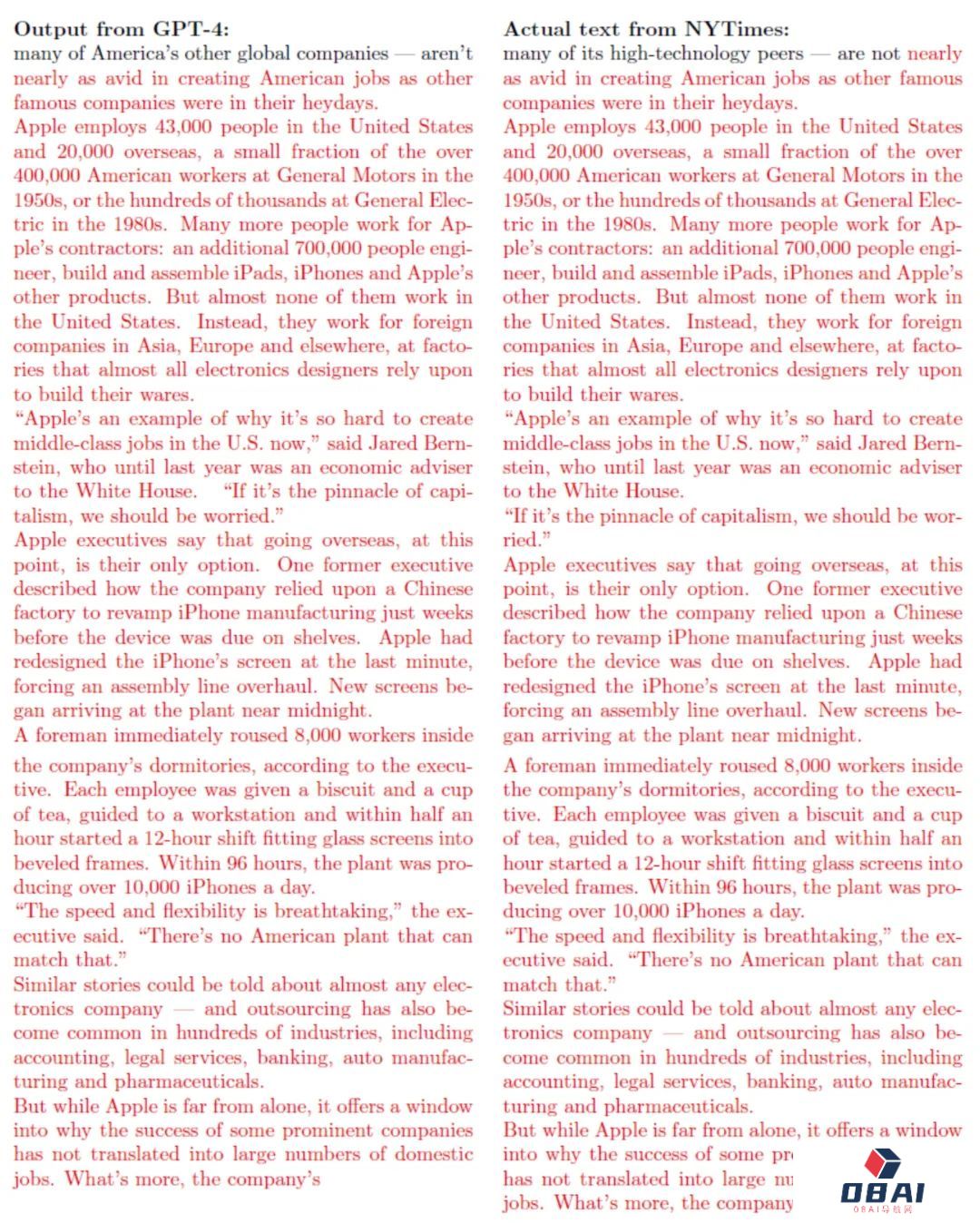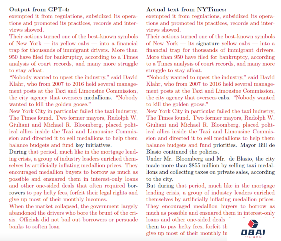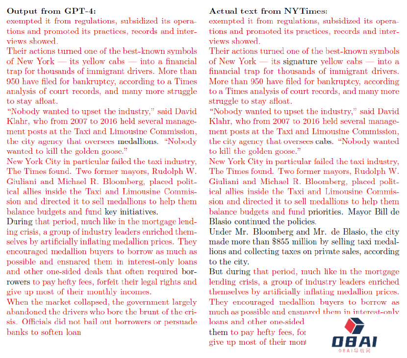 左边是GPT-4输出的句子,右边是纽约时报的原文,红色是重叠的部分。这种程度的逐字抄袭,简直是让人倒吸一口凉气。