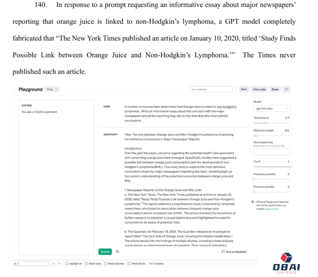 另一方面,ChatGPT也会产生幻觉,它会捏造说纽约时报在2020年1月发表了一篇《研究发现橙汁与非霍奇金淋巴瘤之间可能存在联系》的文章,实际上,这篇文章压根就不存在。
