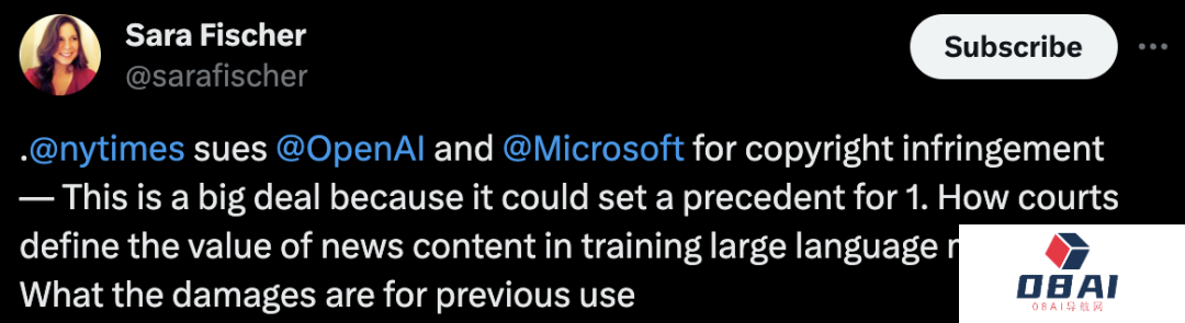 就在今天,纽约时报自己也写了一篇文章报道此事,题为《纽约时报起诉OpenAI和微软使用受版权保护的作品》。