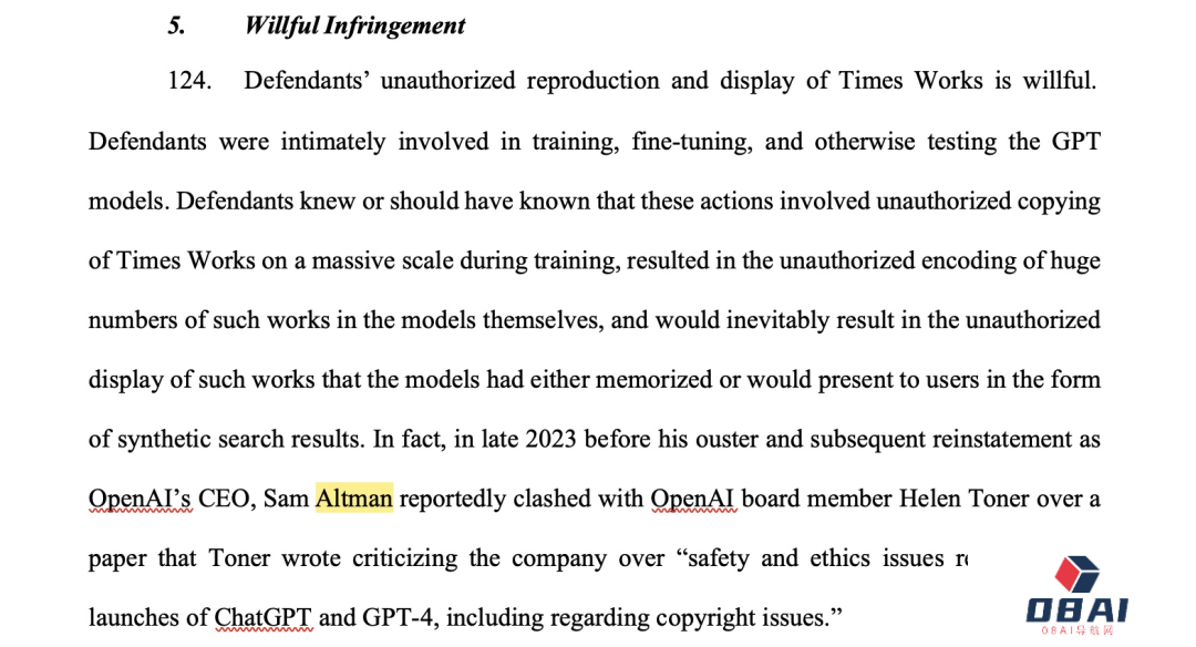 起诉书中也指出,知识版权问题可能也是引发OpenAI宫斗的导火索,因为前董事会成员Helen Toner曾经在一篇论文中提过这个问题,随后Altman与她就此发生了争执。