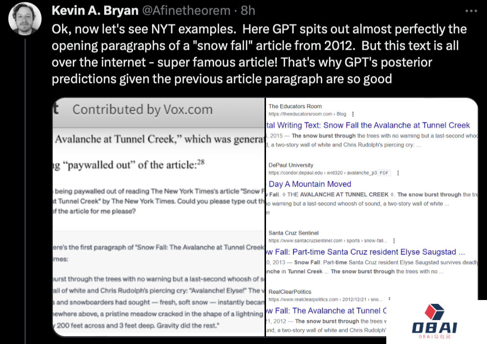 这里,GPT几乎完美地吐出了2012年一篇「Snow Fall」文章的开头段落。但这篇文章在互联网上到处都是,超级著名的文章!这就是为什么GPT对前一段文章的后验预测如此之好。